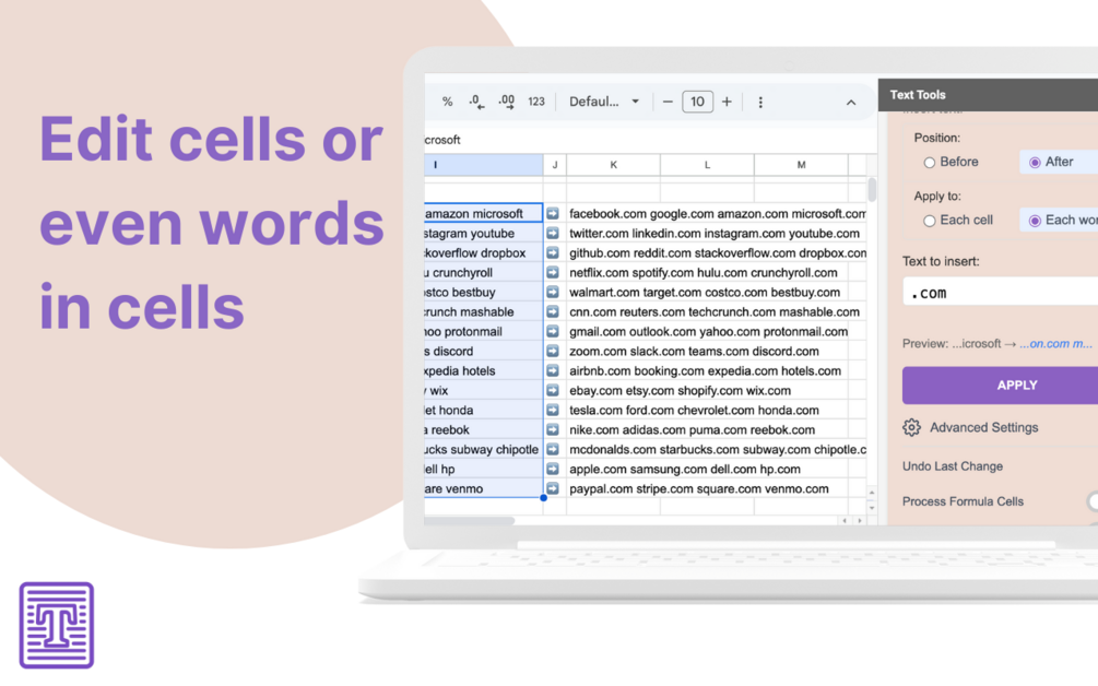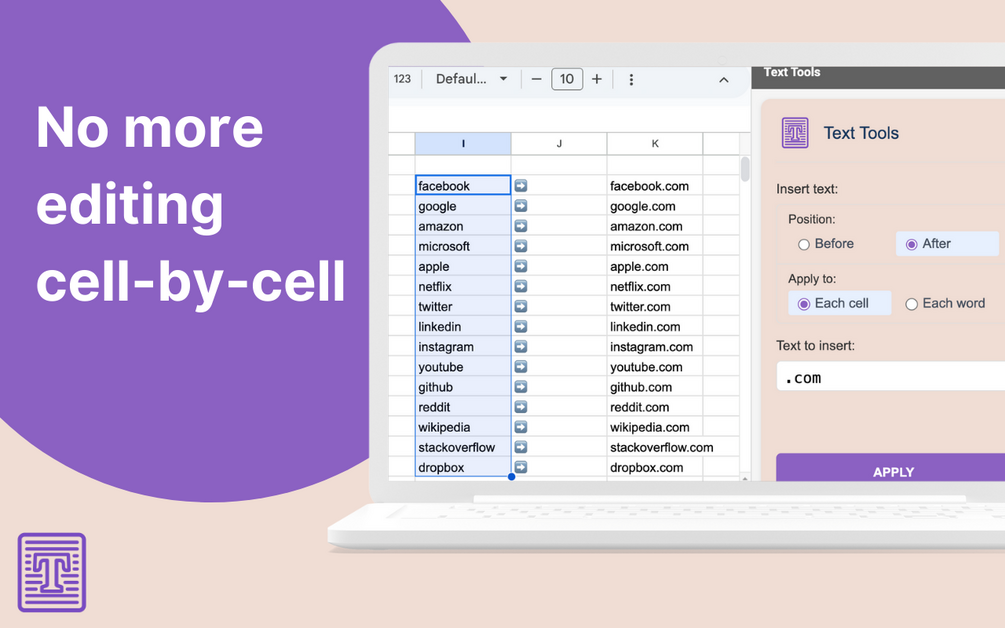 Transform text in Google Sheets with advanced insertion capabilities. Try Text Tools for free!